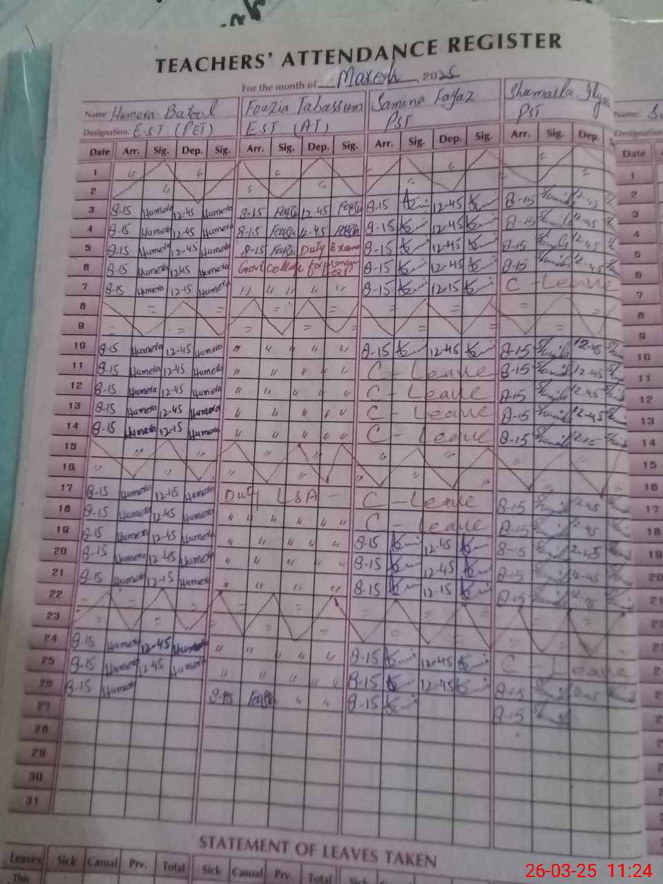 | Leave | Duty | Absent | Maternity | Medical | Ex- Pak |