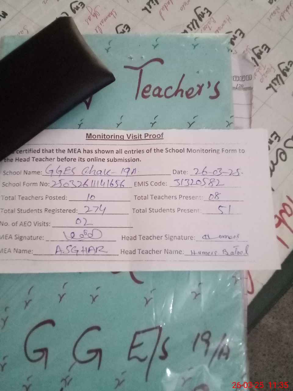 | Attendance Register | Head Teacher | MEA with School | Visit Proof |