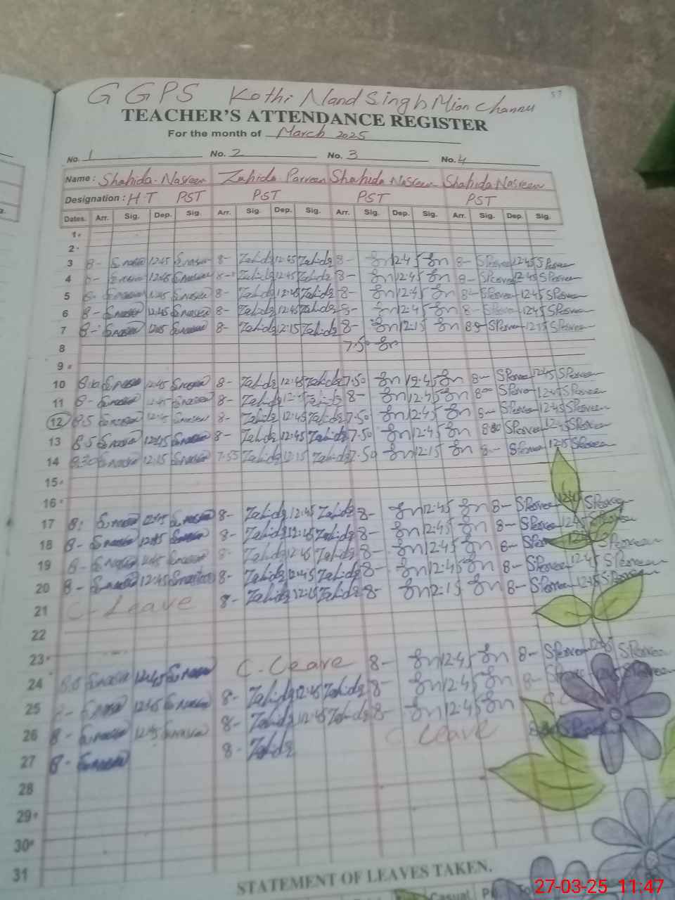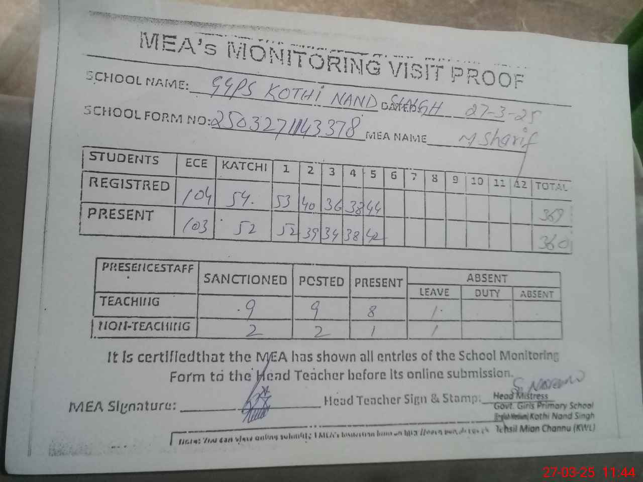 | Attendance Register | Head Teacher | MEA with School | Visit Proof |