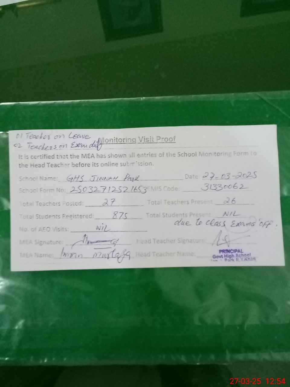 | EMIS Code: 31330062 | Name of School: GHS JINNAH PARK | |||