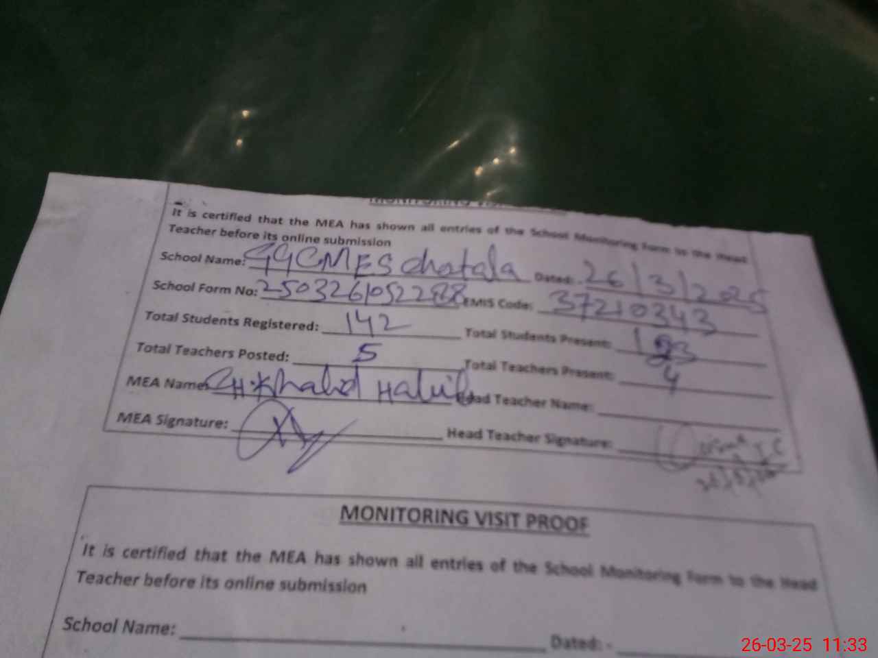 | Attendance Register | Head Teacher | MEA with School | Visit Proof |