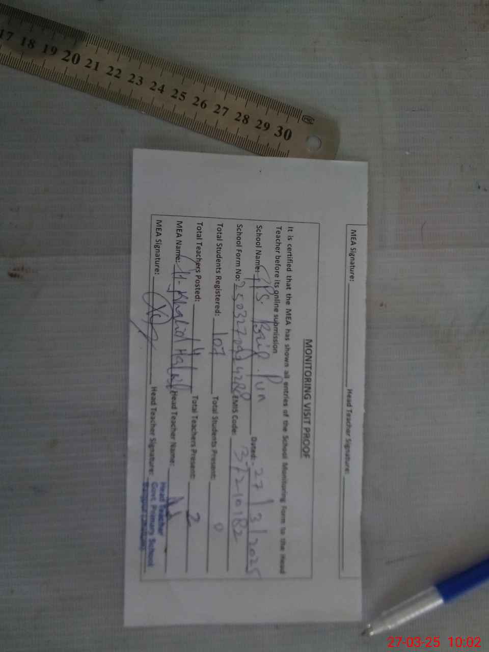 | Attendance Register | Head Teacher | MEA with School | Visit Proof |