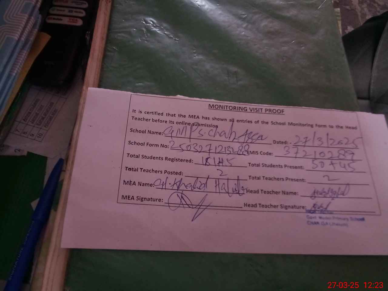 | Attendance Register | Head Teacher | MEA with School | Visit Proof |