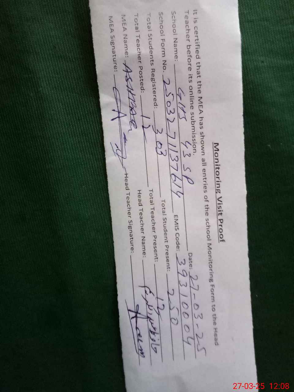 | Attendance Register | Head Teacher | MEA with School | Visit Proof |