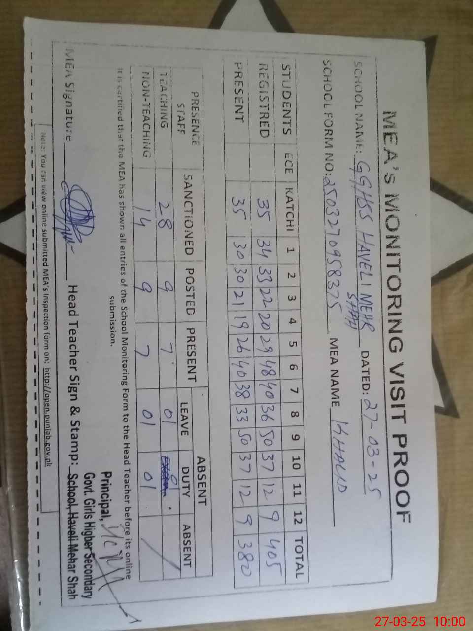 | Attendance Register | Head Teacher | MEA with School | Visit Proof |