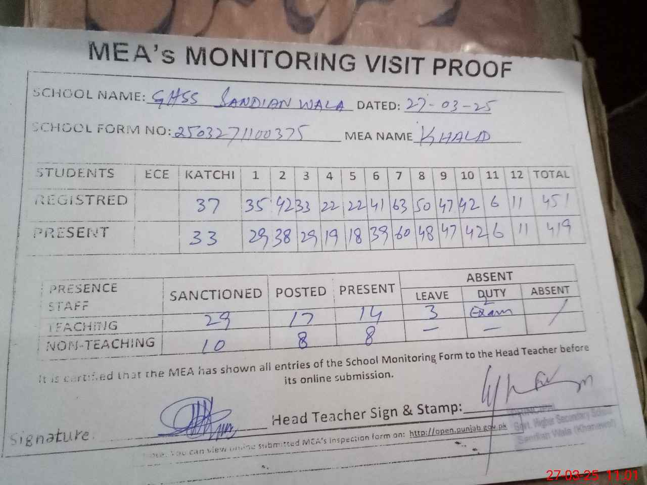 | EMIS Code: 36410015 | Name of School: GHSS SANDIAN WALA, KHANEWAL | |||
