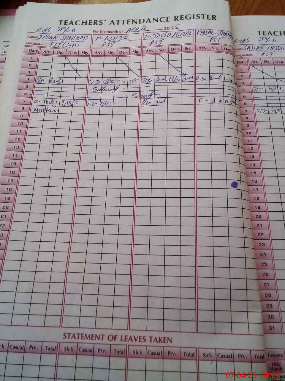 | 36**** | Im**** Sh**** | Regular | 0 | 12 | 0 | 0 | 0 | 0 | 0 | 0 | 0 | Exam Duty | |