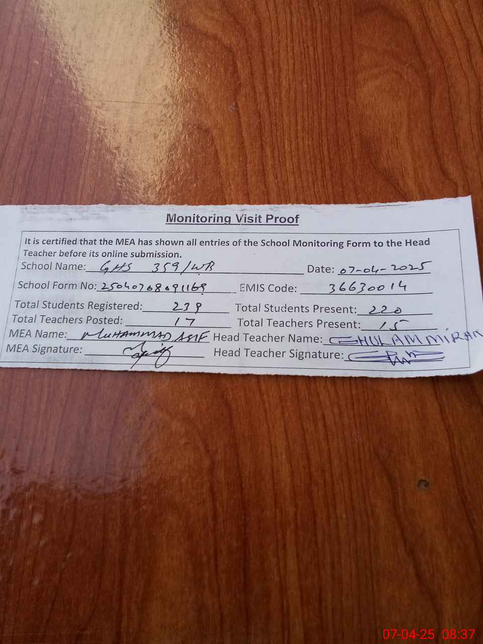 | Attendance Register | Head Teacher | MEA with School | Visit Proof |