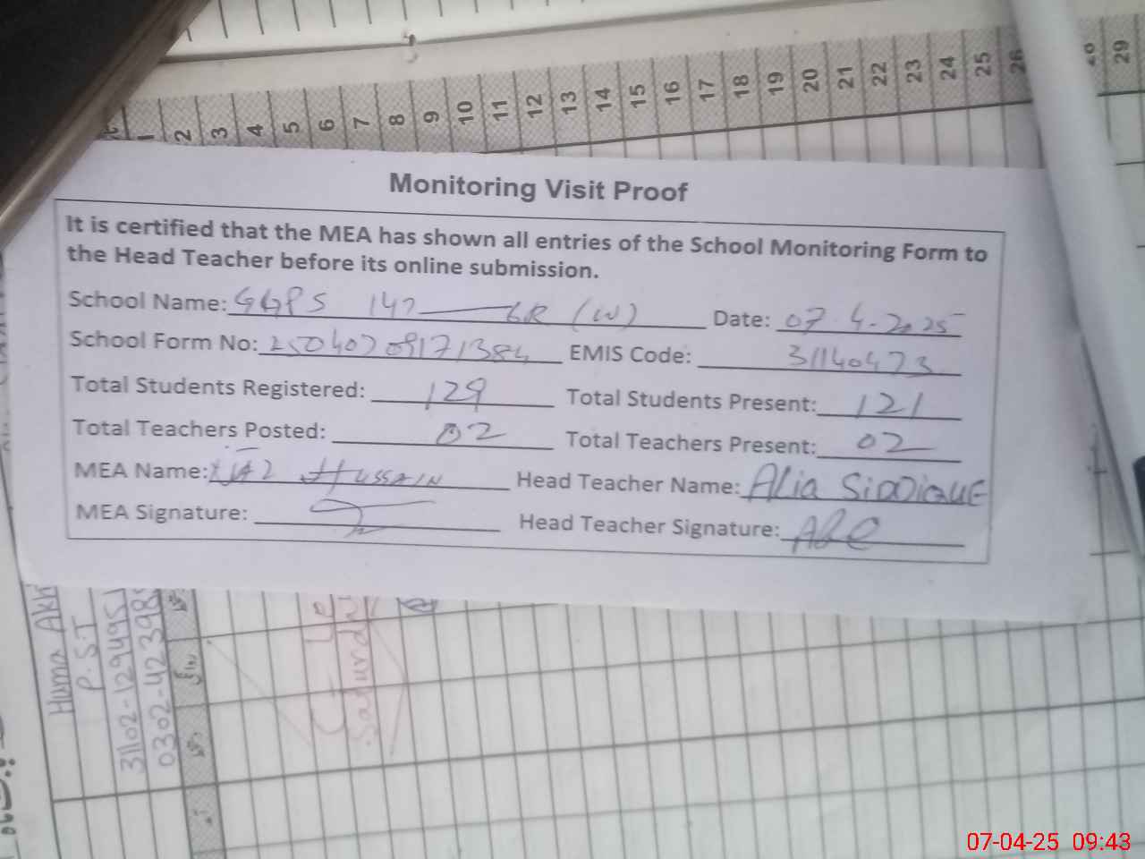 | Attendance Register | Head Teacher | MEA with School | Visit Proof |