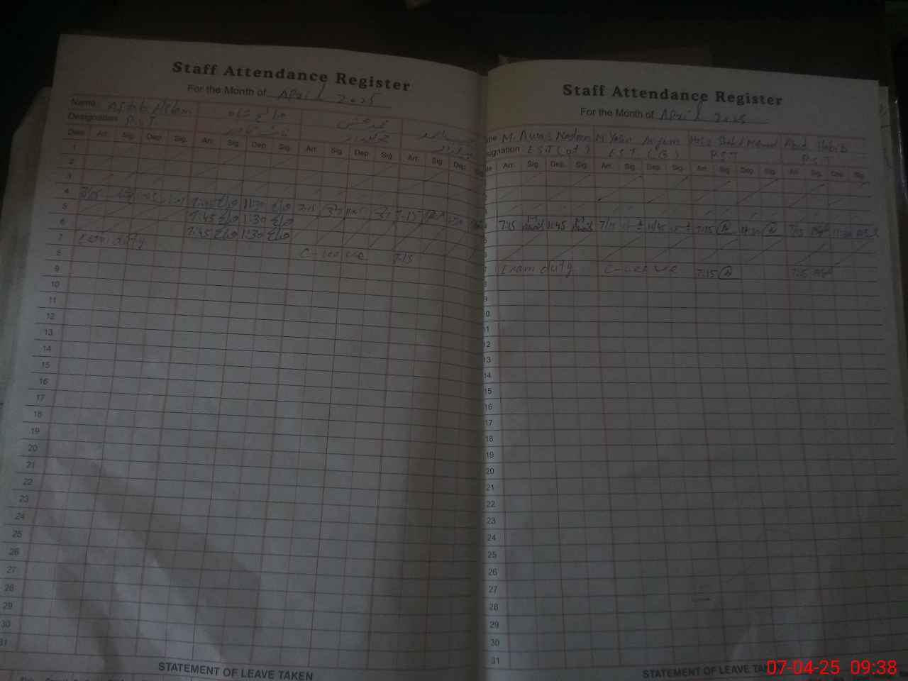 | Total no. of Classrooms: 7 No. of Classrooms Used for Teaching: 6 No. of Classrooms Storing Old Furniture, FTBs, etc: 0Comments if Any: Sir students attendence on sis not carried out Out of 09 Teachers only 04 are physically present 03 Teachers are on Exam duty 02 teachers are on leave |