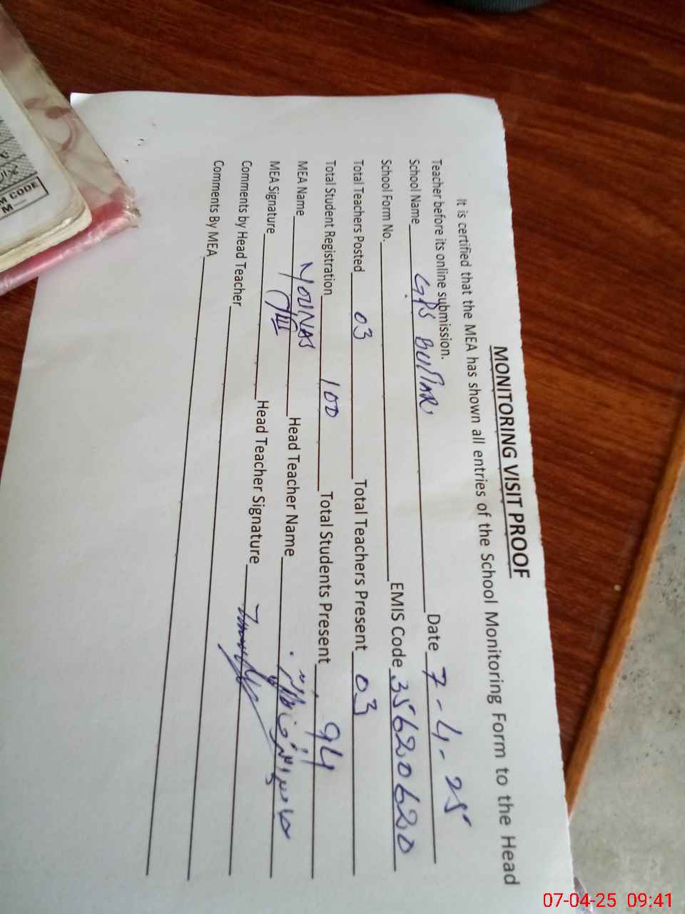 | Attendance Register | Head Teacher | MEA with School | Visit Proof |