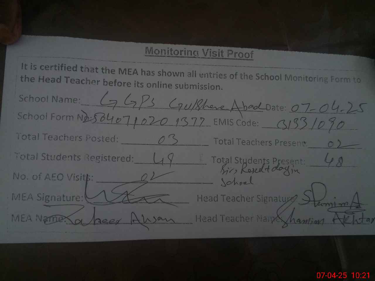 | Monitoring Date: 07-04-2025 | Start Time: 07-04-2025 09:45 AM | End Time: 07-04-2025 10:27 AM | Name of MEA: Za**** Ah**** | |
