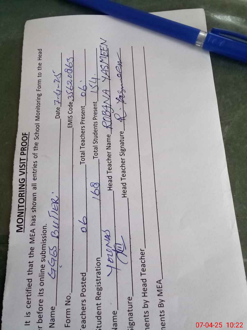 | Attendance Register | Head Teacher | MEA with School | Visit Proof |