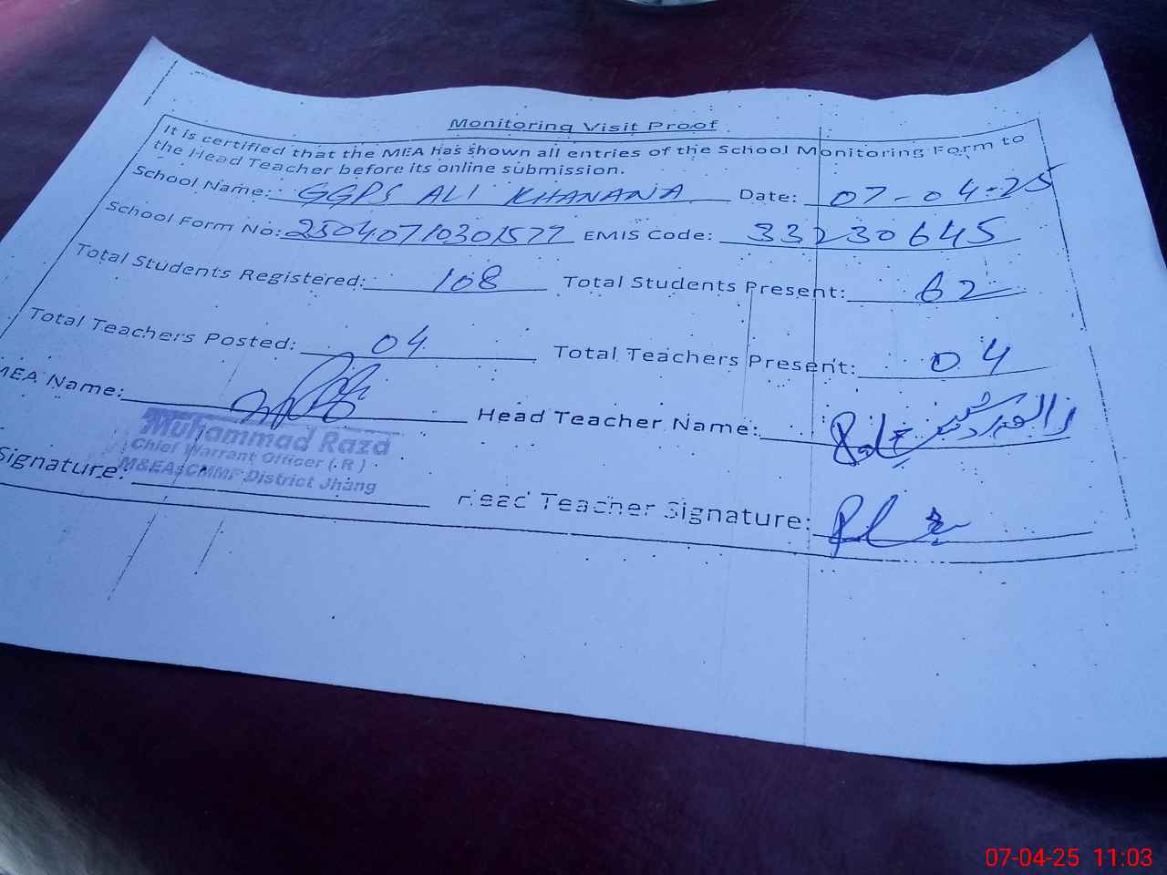 | Attendance Register | Head Teacher | MEA with School | Visit Proof |
