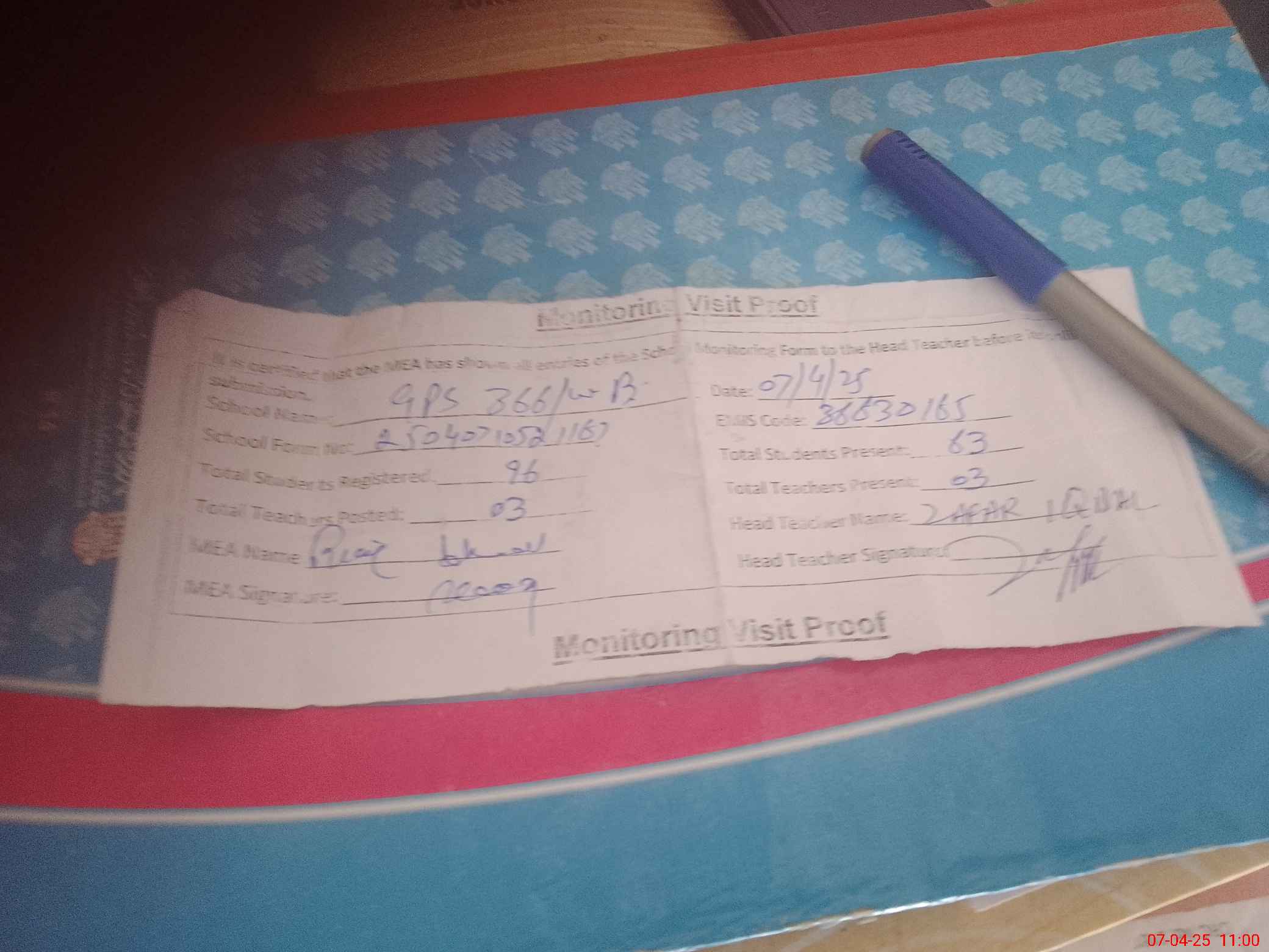 | Attendance Register | Head Teacher | MEA with School | Visit Proof |