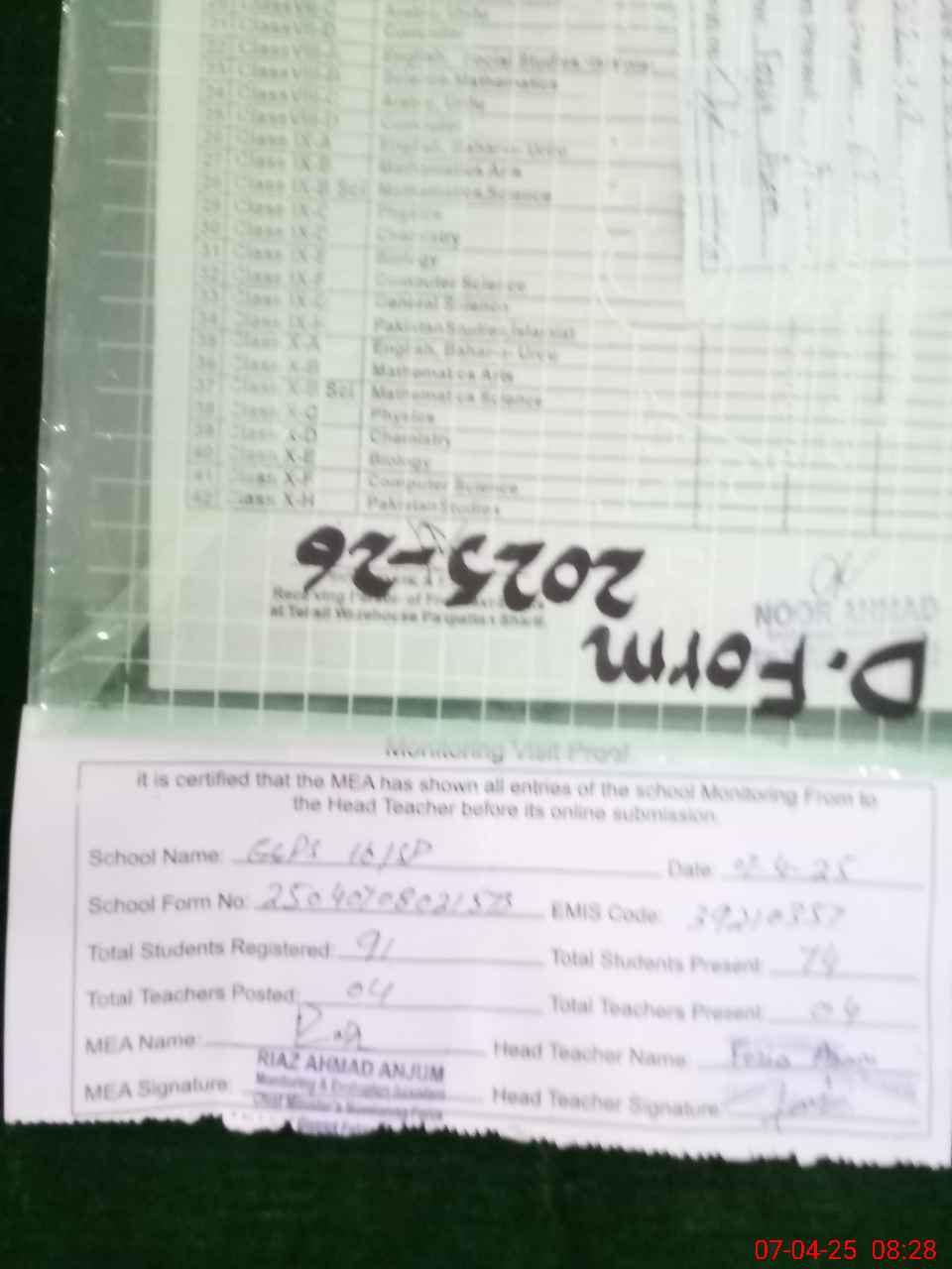 | Certified that this School was Inspected by the Undersigned MEA/DMO Today and the Information Stated Above is as Per Record. | |||||