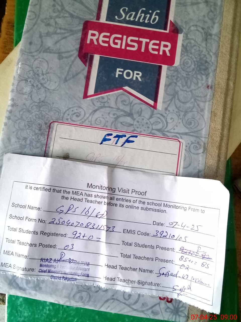 | EMIS Code: 39210105 | Name of School: GPS 16/SP PO PAKPATTAN | |||