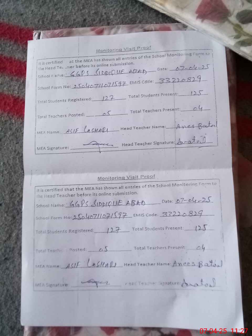| Attendance Register | Head Teacher | MEA with School | Visit Proof |