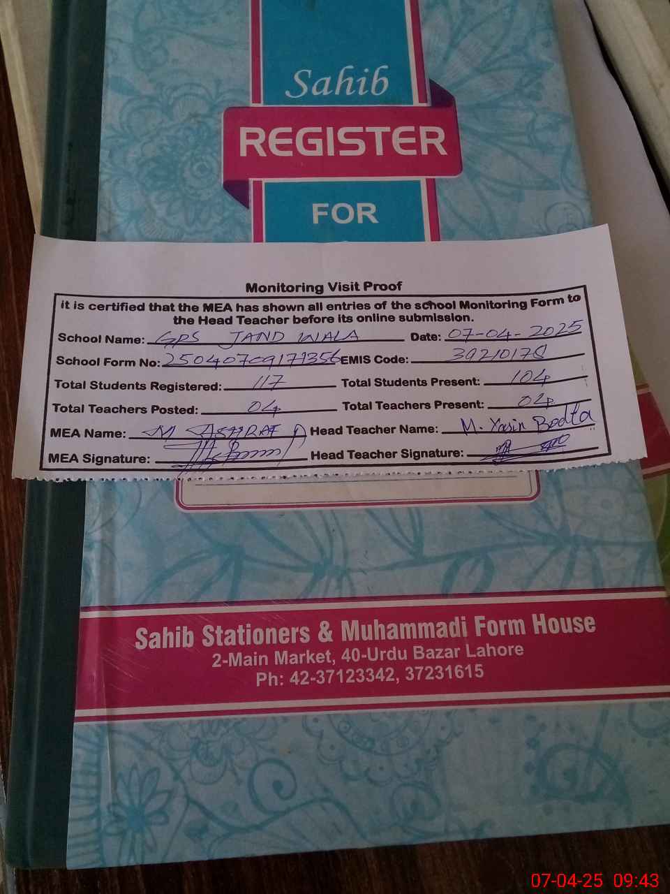 | Attendance Register | Head Teacher | MEA with School | Visit Proof |