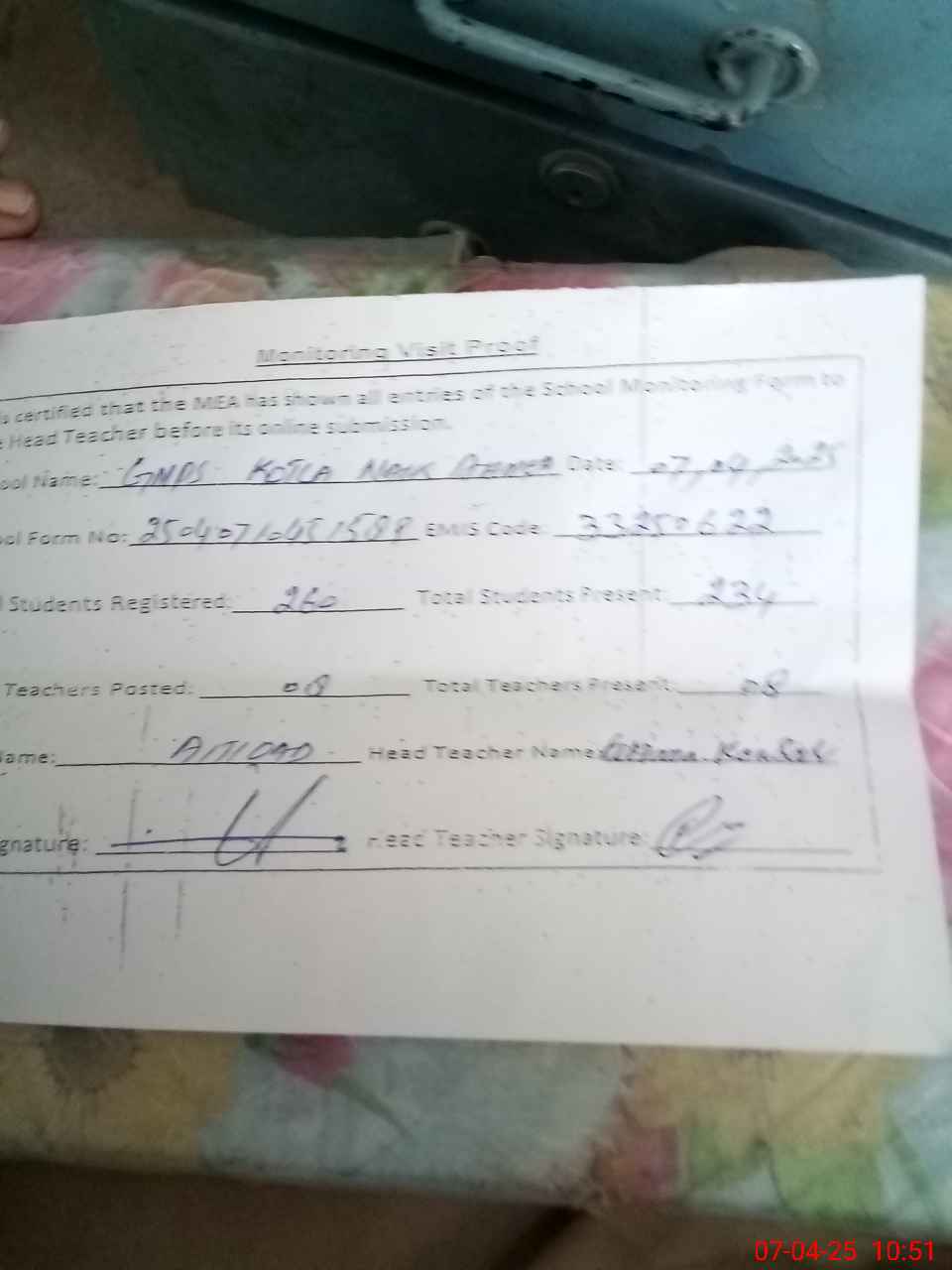 | Attendance Register | Head Teacher | MEA with School | Visit Proof |
