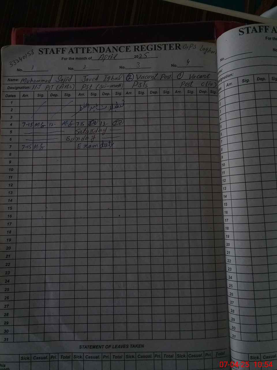 | 33**** | Ja**** Iq**** | PST | Regular | 2 | 10 | 0 | 0 | 0 | 0 | 0 | 0 | 2 | Exam Duty |