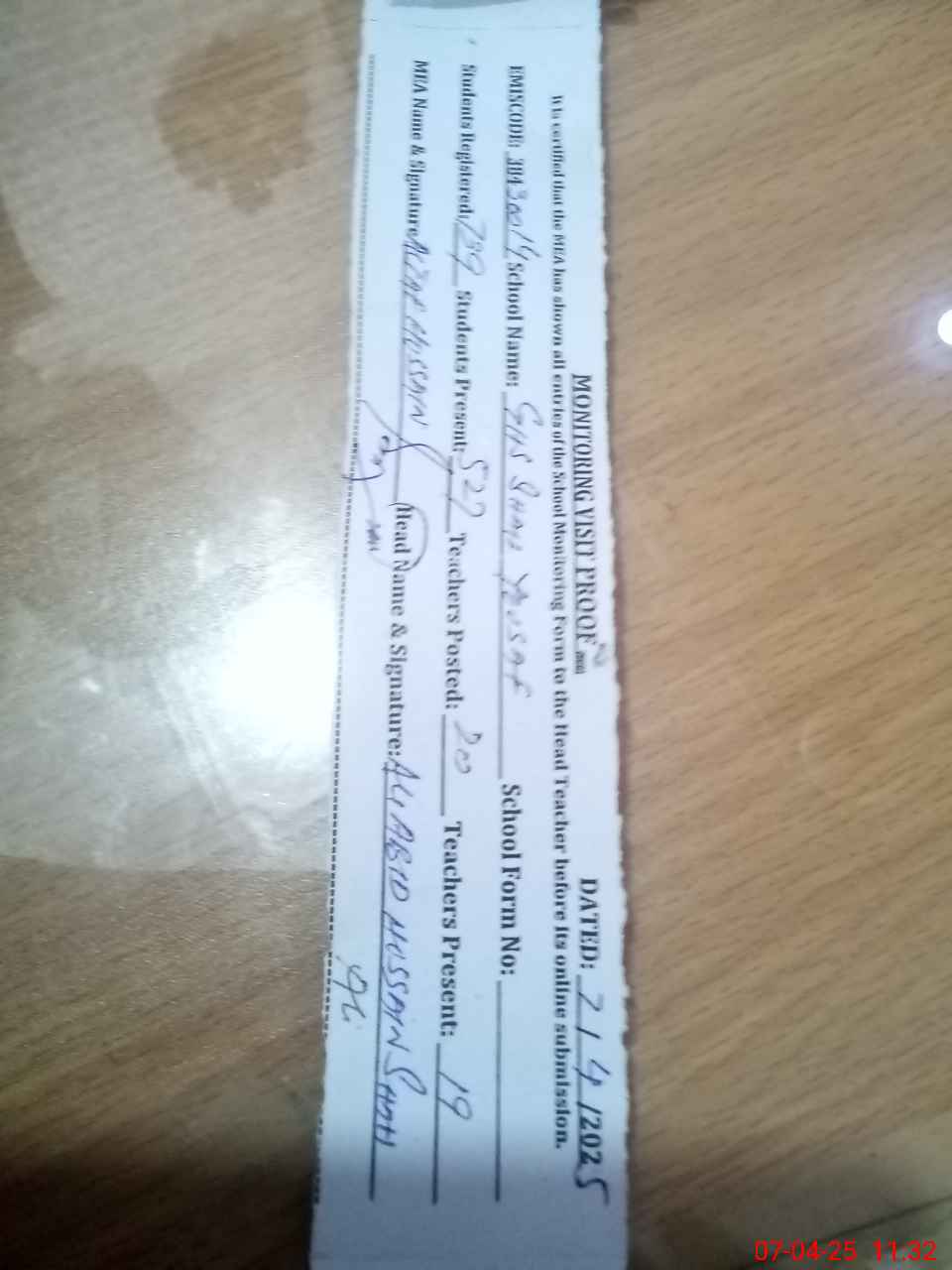 | Attendance Register | Head Teacher | MEA with School | Visit Proof |