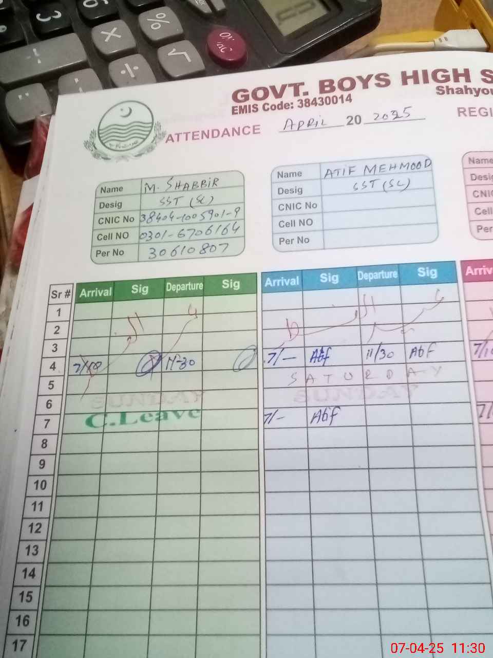 | CNIC | Full Name | Designation | R/C | Absence during last cal. month |
