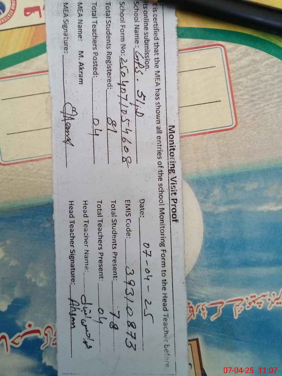 | Attendance Register | Head Teacher | MEA with School | Visit Proof |