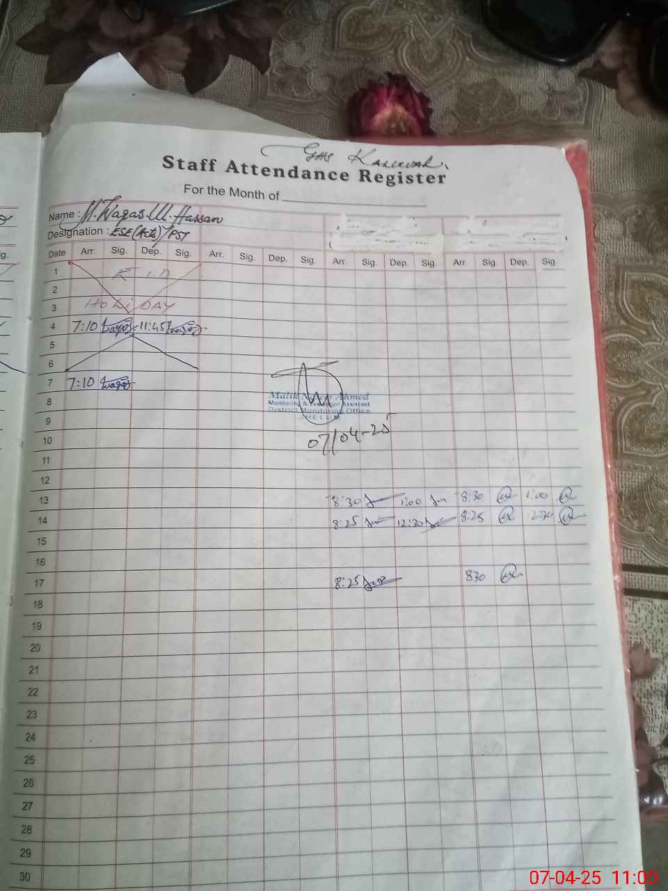 | Monitoring Date: 07-04-2025 | Start Time: 07-04-2025 09:57 AM | End Time: 07-04-2025 11:02 AM | Name of MEA: Na**** Ah**** | |