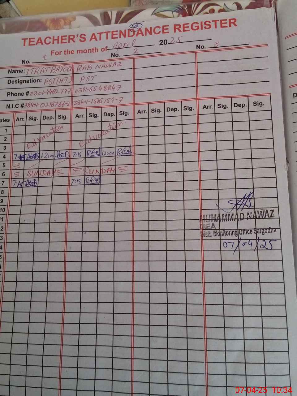 | Name: IT**** BA**** Designation: (School Headmaster's/Headmistress's) PST Phone/Cell Number: 03**** |
