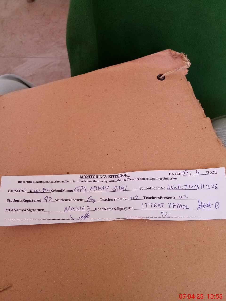 | Certified that this School was Inspected by the Undersigned MEA/DMO Today and the Information Stated Above is as Per Record. | |||||