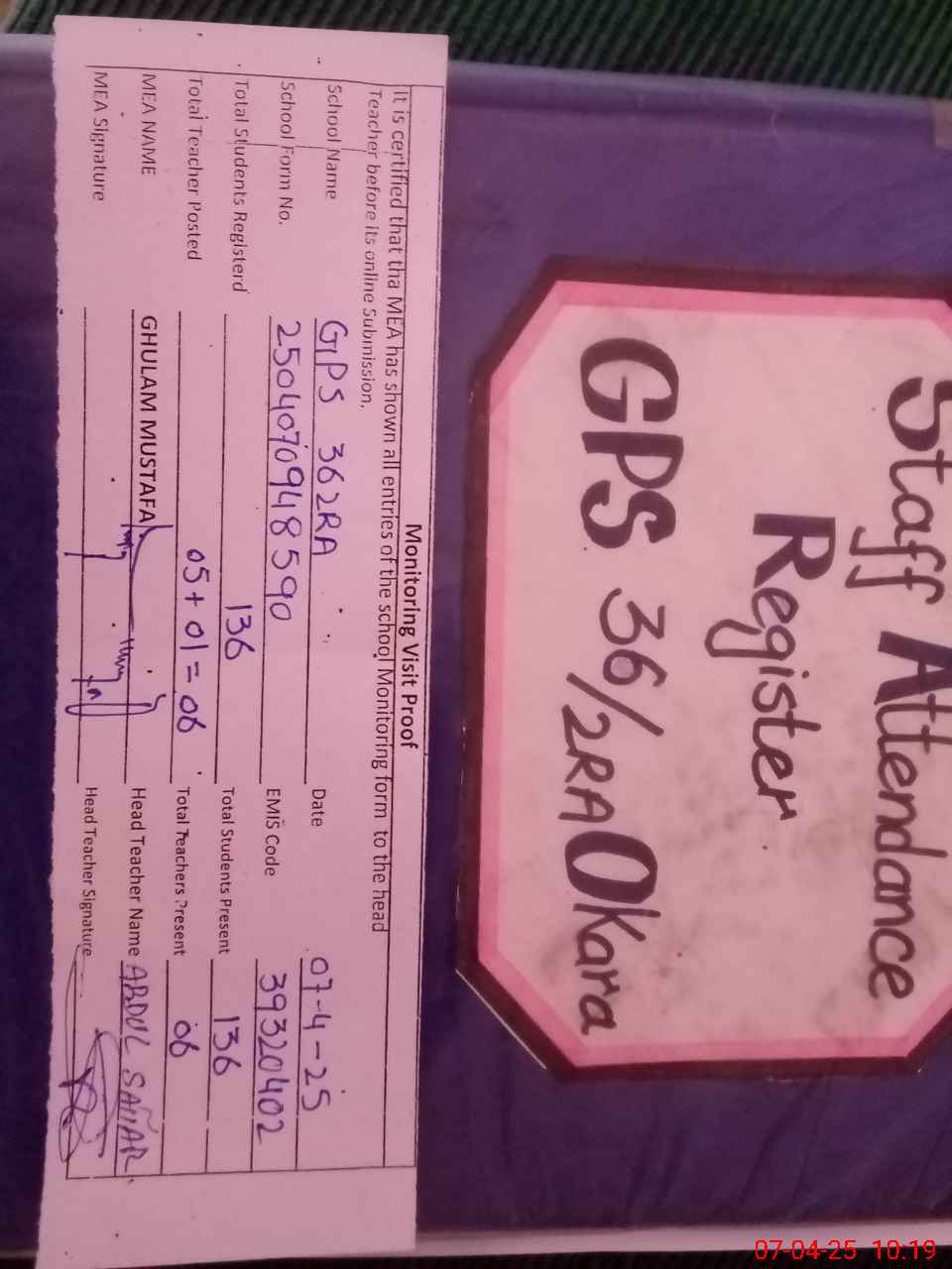 | Attendance Register | Head Teacher | MEA with School | Visit Proof |