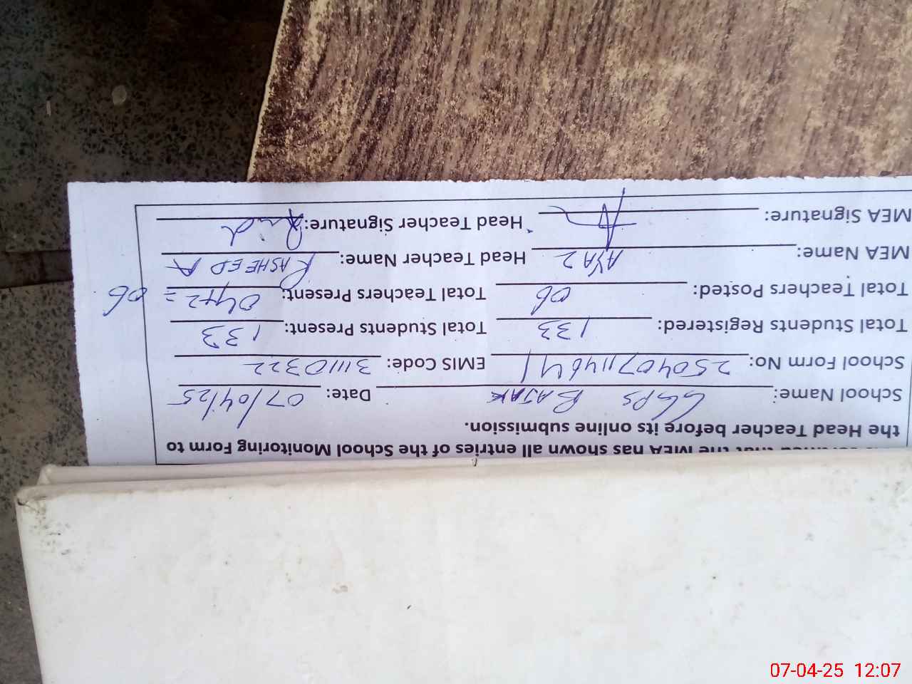 | Attendance Register | Head Teacher | MEA with School | Visit Proof |