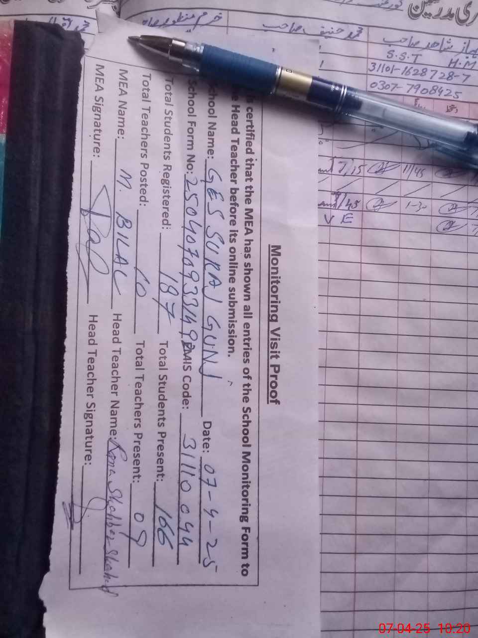 | Attendance Register | Head Teacher | MEA with School | Visit Proof |