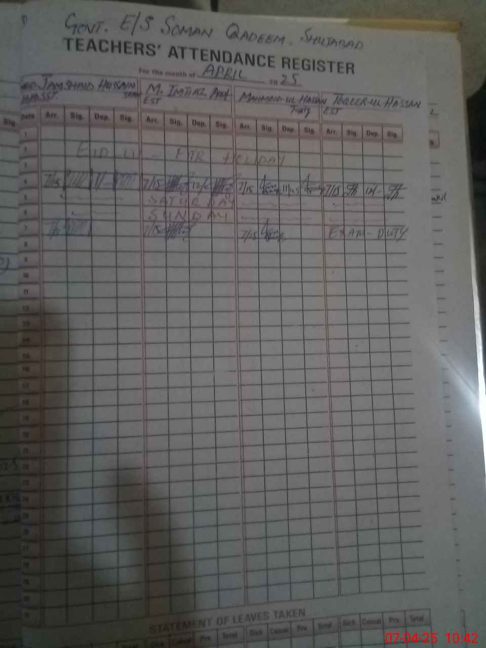 | 36**** | To**** UlHa**** | EST | Regular | 0 | 0 | 0 | 0 | 0 | 0 | 0 | 0 | 0 | Exam Duty |
