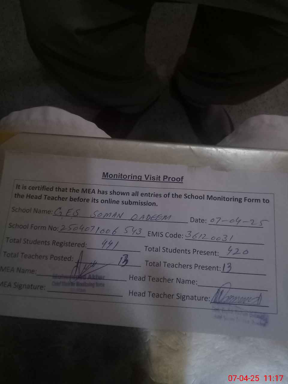 | Attendance Register | Head Teacher | MEA with School | Visit Proof |