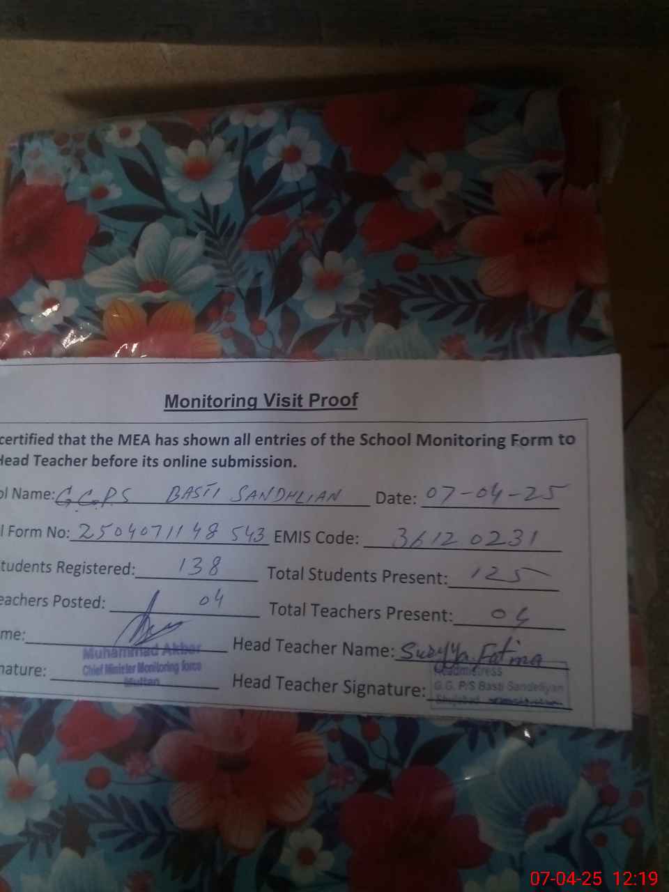 | Attendance Register | Head Teacher | MEA with School | Visit Proof |