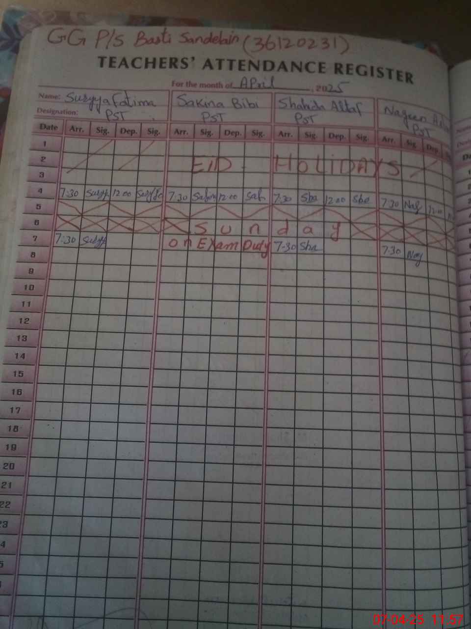 | 36**** | Sa**** Bi**** | PST | Regular | 0 | 0 | 0 | 0 | 0 | 0 | 0 | 0 | 0 | Exam Duty |