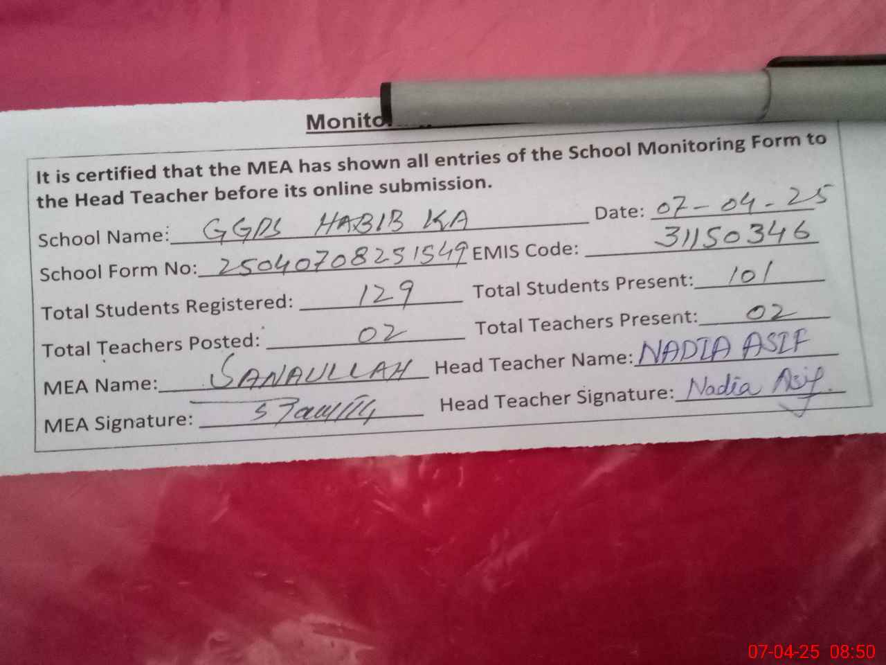 | EMIS Code: 31150346 | Name of School: GGPS HABIB KA | |||
