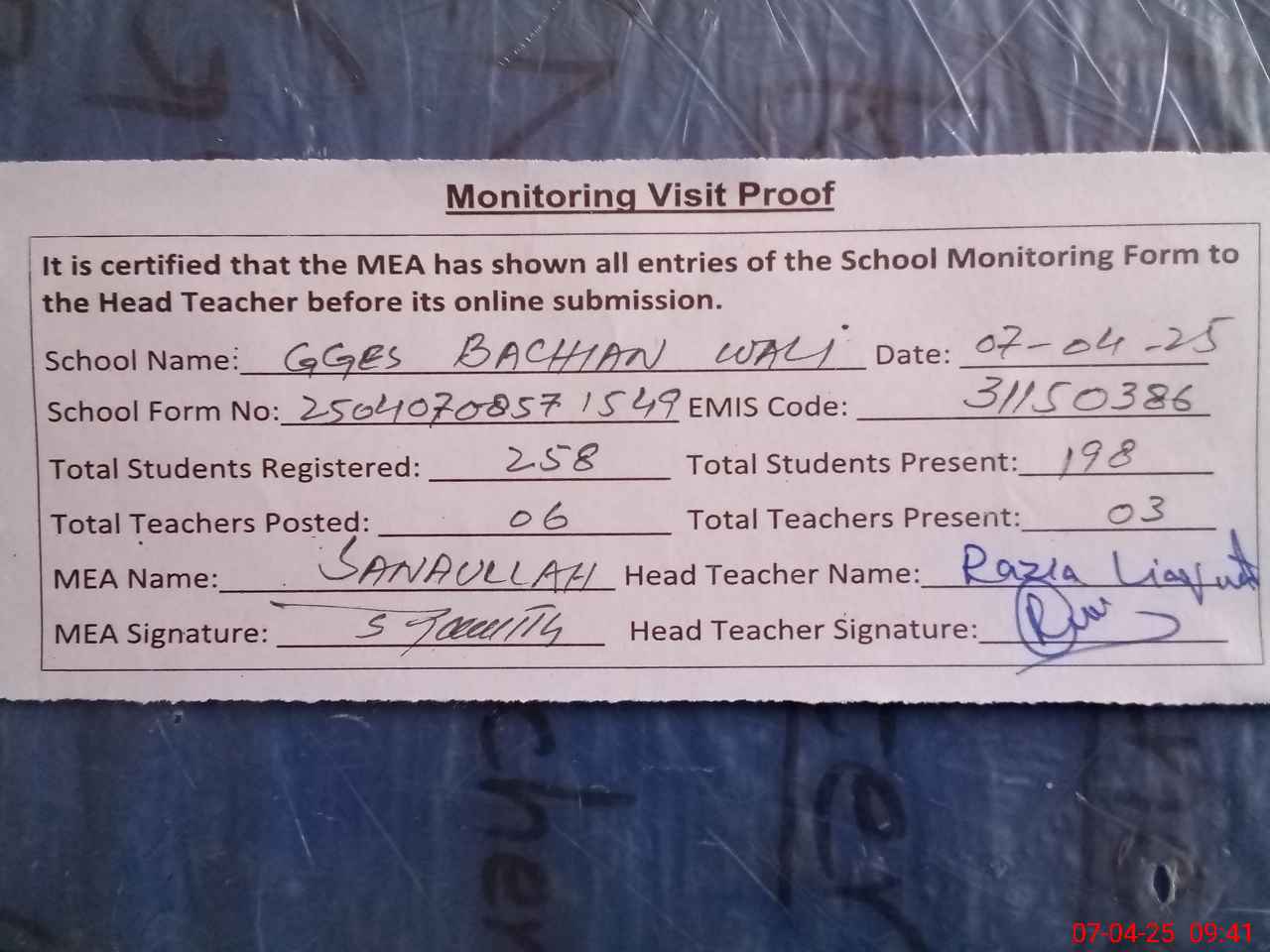 | Attendance Register | Head Teacher | MEA with School | Visit Proof |