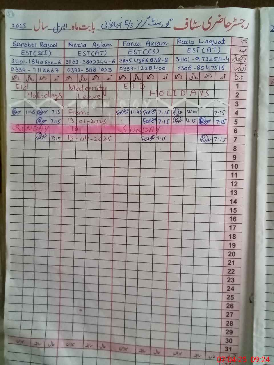 | CNIC | Full Name | Designation | R/C | Absence During Last Calender Month |