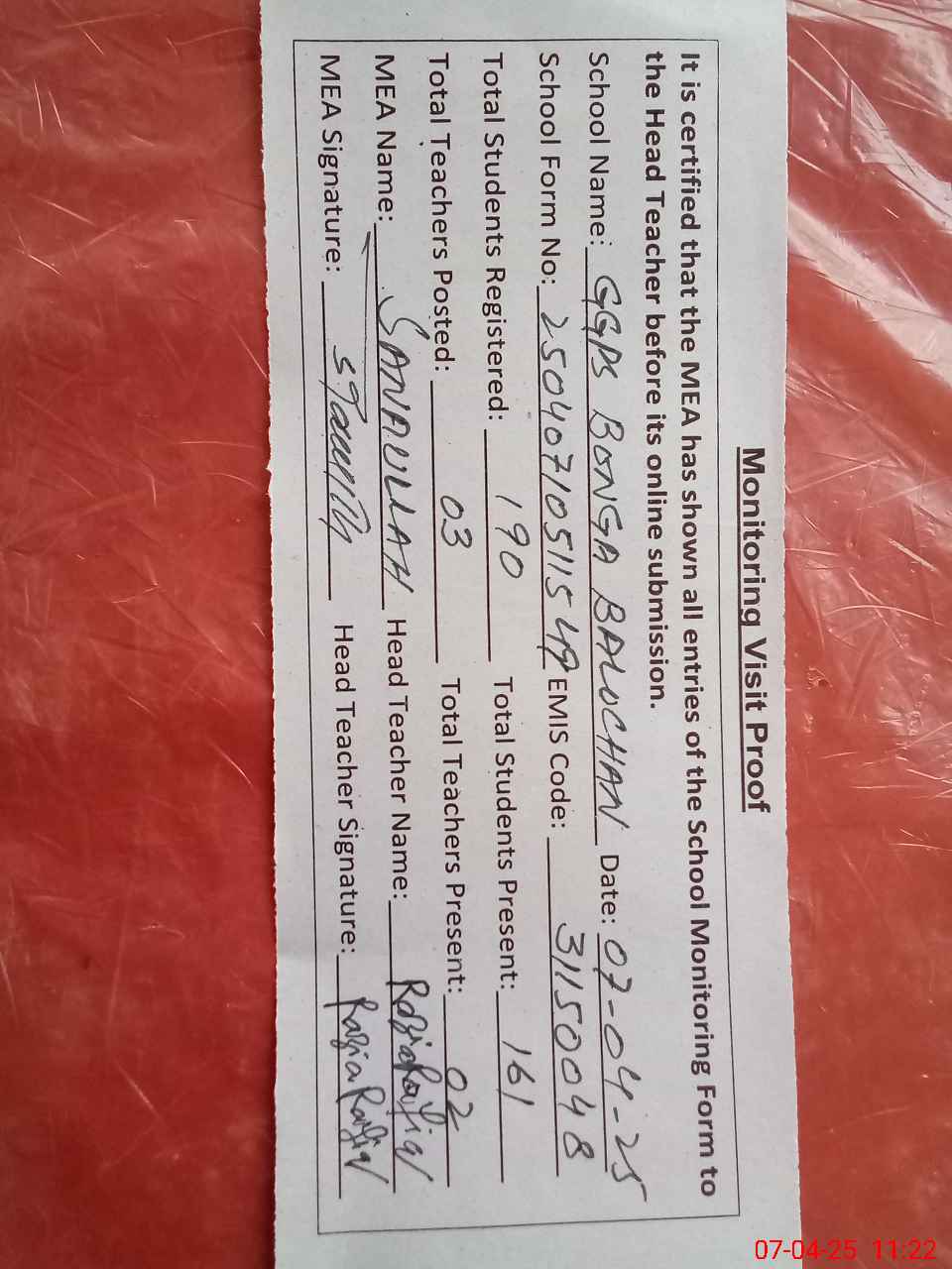 | EMIS Code: 31150048 | Name of School: GGPS BONGA BALOCHAAN | |||