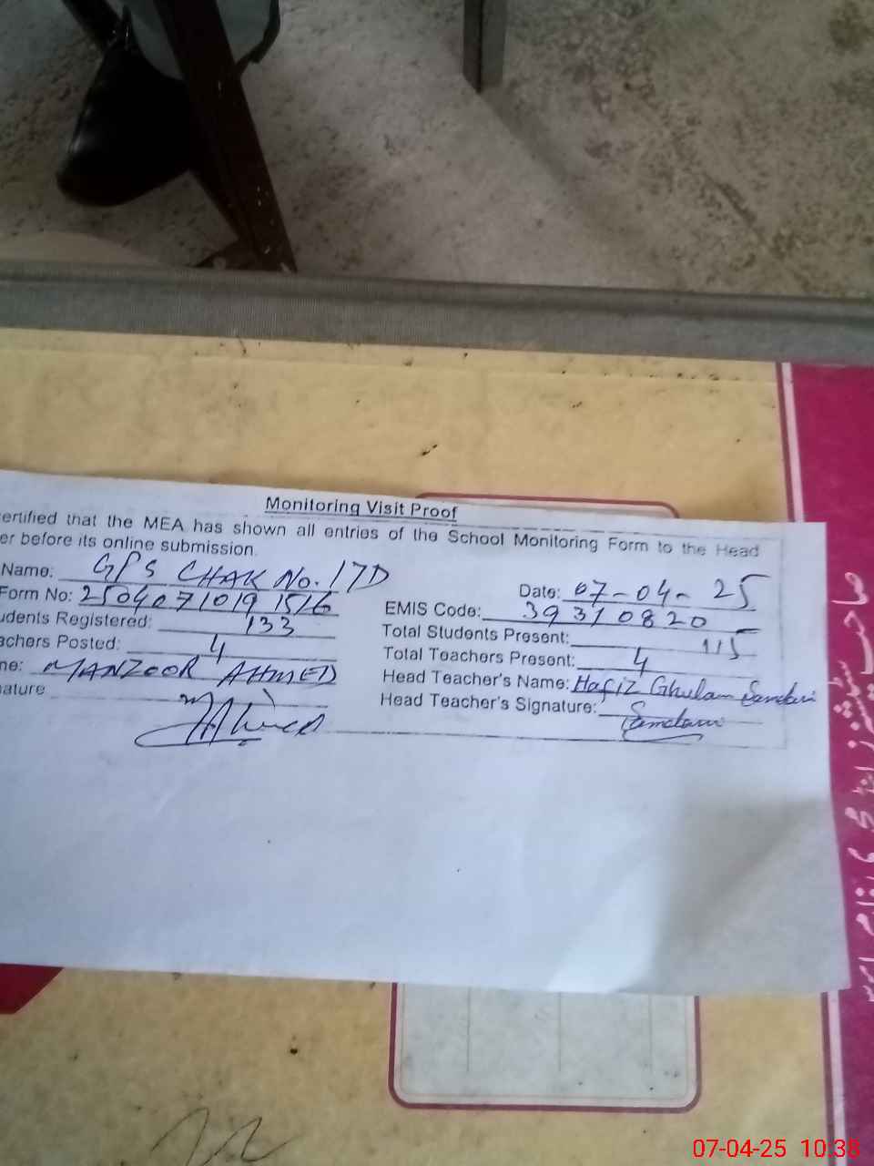 | Attendance Register | Head Teacher | MEA with School | Visit Proof |