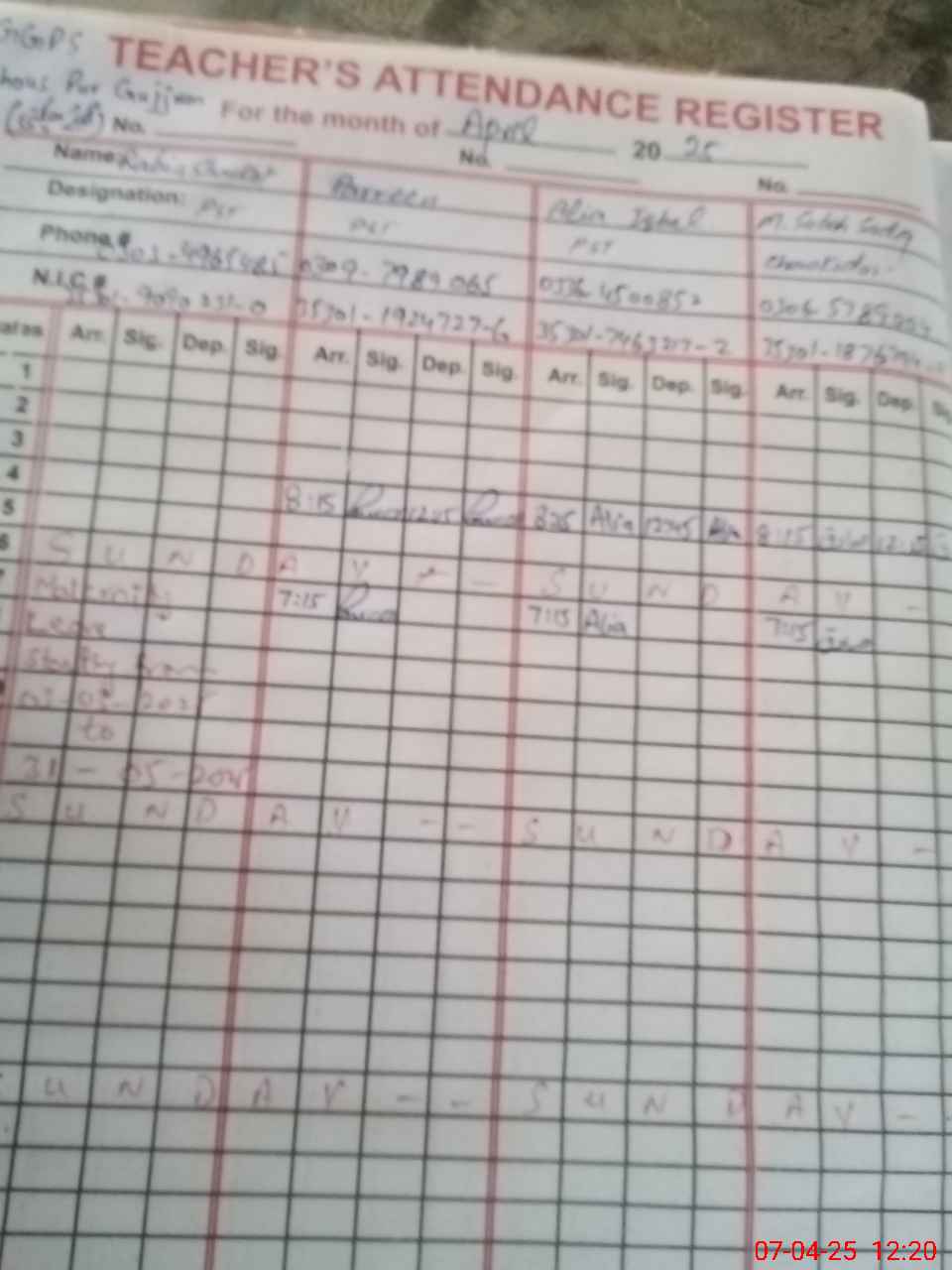 | CNIC | Full Name | Designation | R/C | Absence During Last Calender Month |