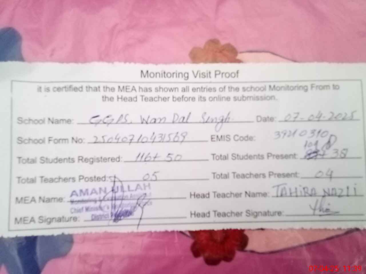 | Attendance Register | Head Teacher | MEA with School | Visit Proof |