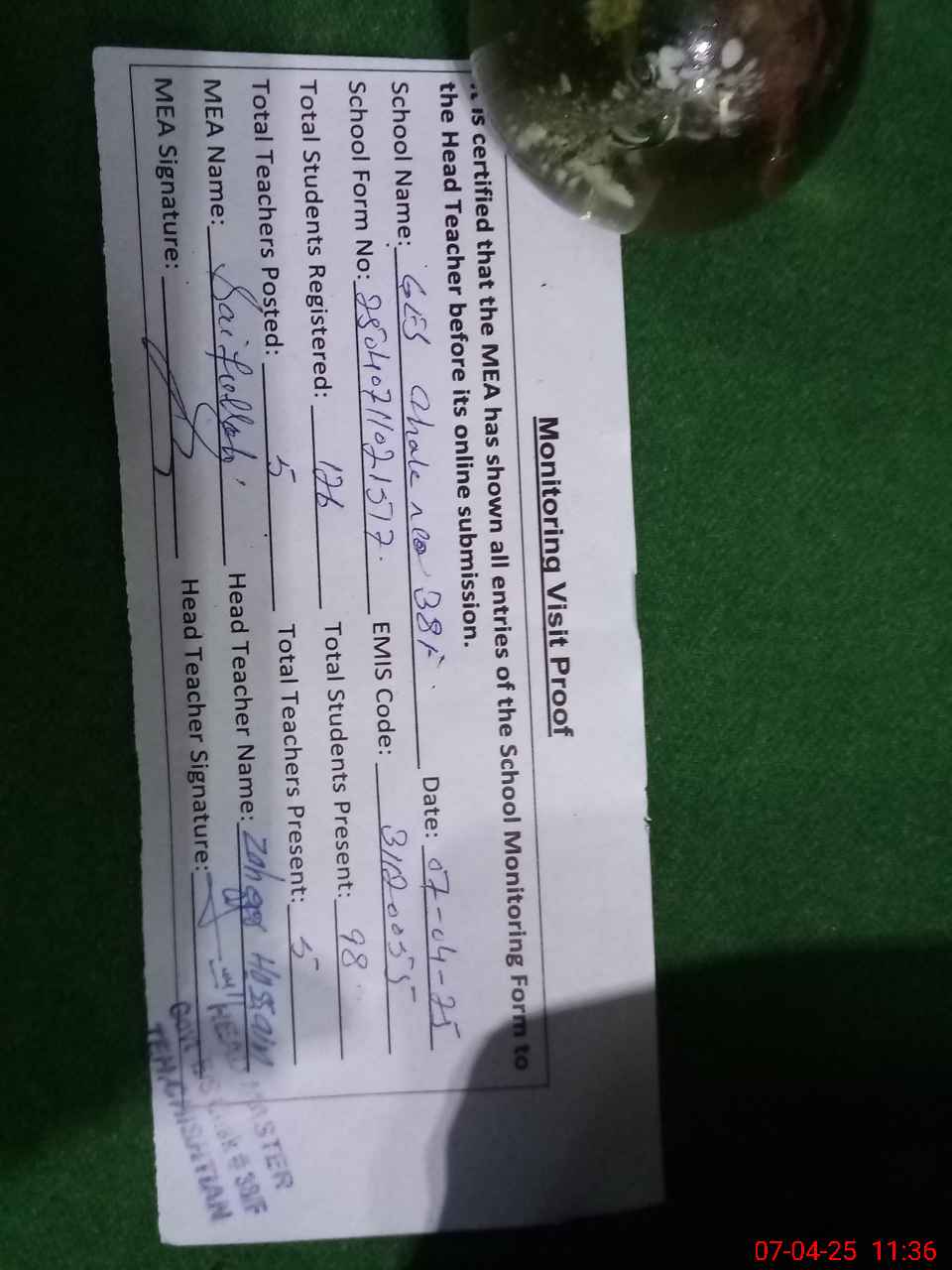 | Attendance Register | Head Teacher | MEA with School | Visit Proof |