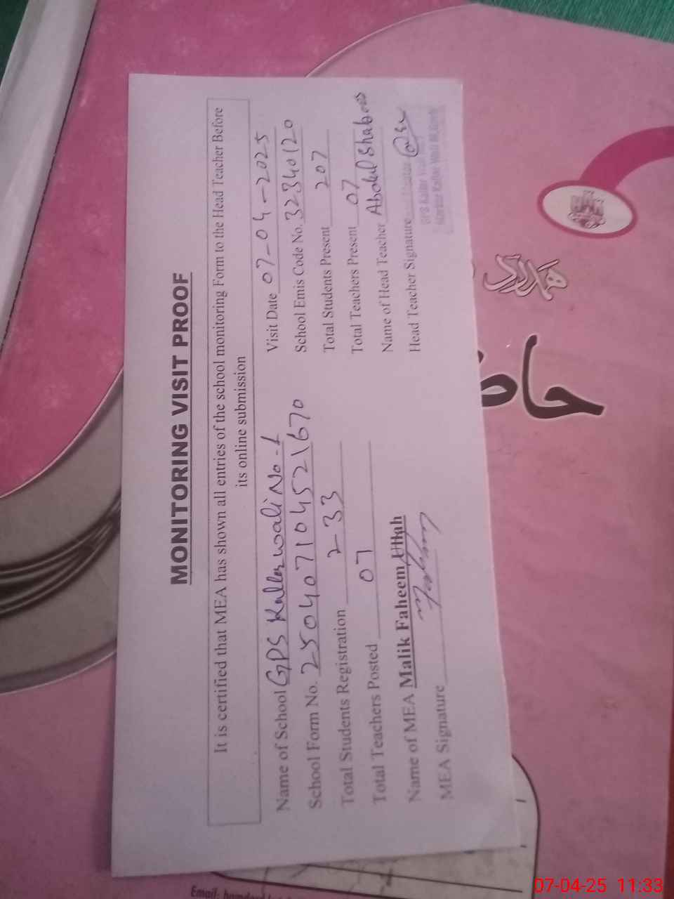 | Attendance Register | Head Teacher | MEA with School | Visit Proof |