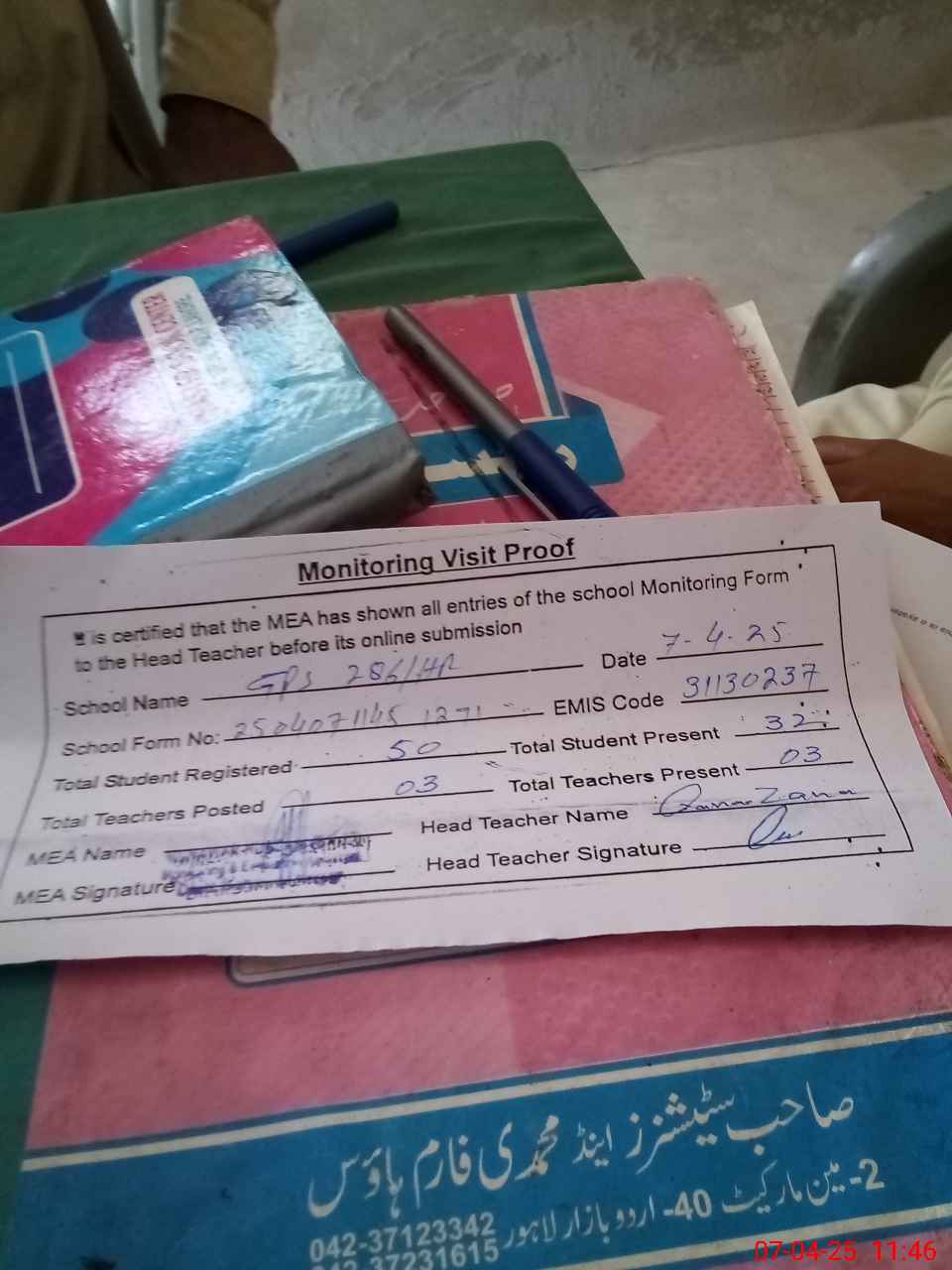| Attendance Register | Head Teacher | MEA with School | Visit Proof |