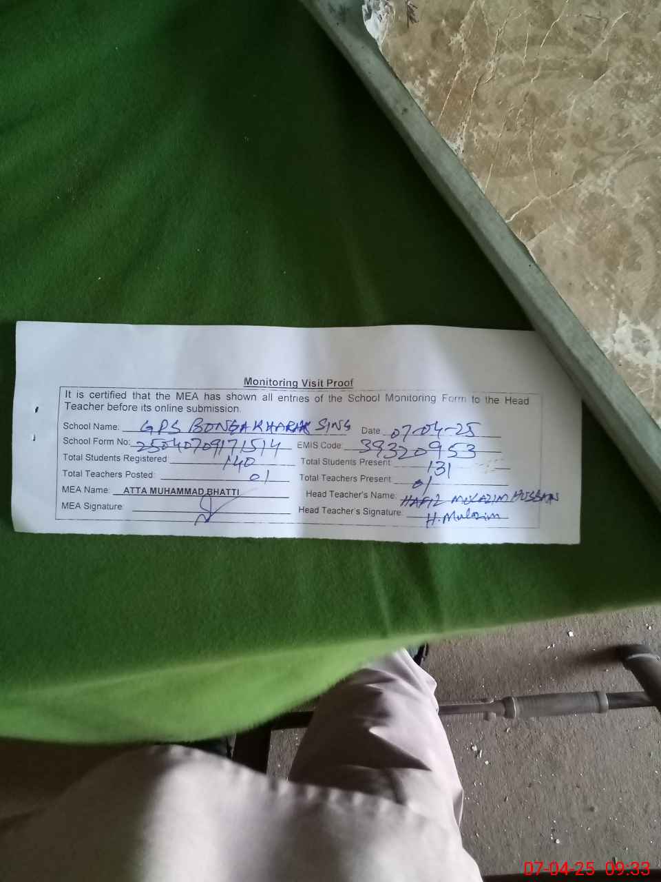 | Attendance Register | Head Teacher | MEA with School | Visit Proof |