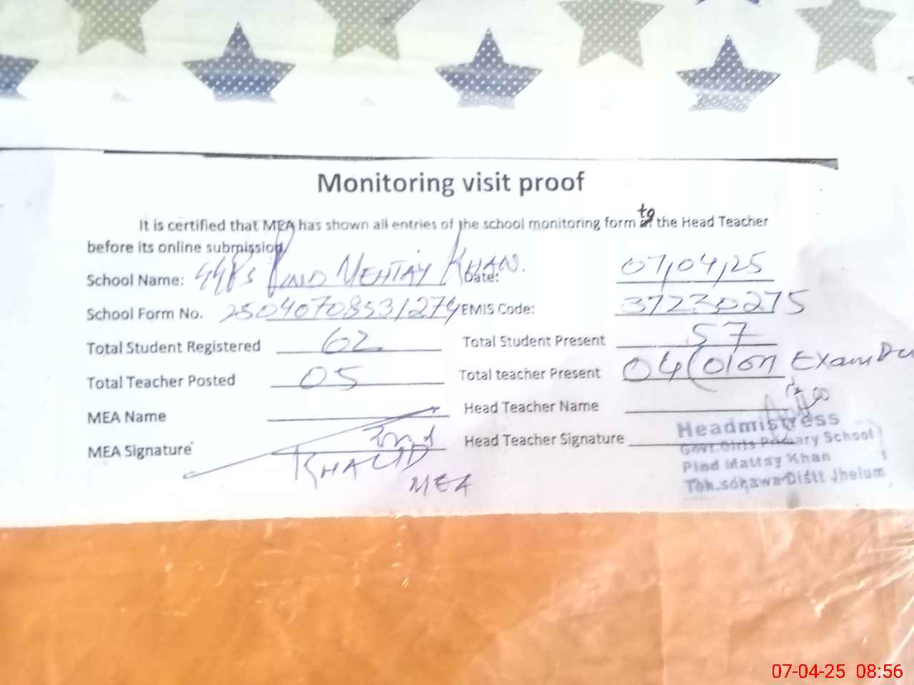 | Attendance Register | Head Teacher | MEA with School | Visit Proof |